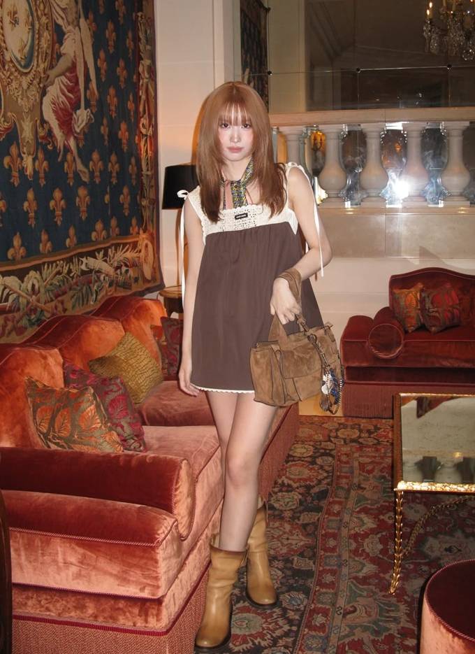 공개한 사진에서 모모는 아이보리 컬러 니트 패널과 레이스 디테일이 더해진 브라운 컬러의 미니 드레스룩으로 발랄하면서도 레트로 무드의 스타일링을 완성했다.