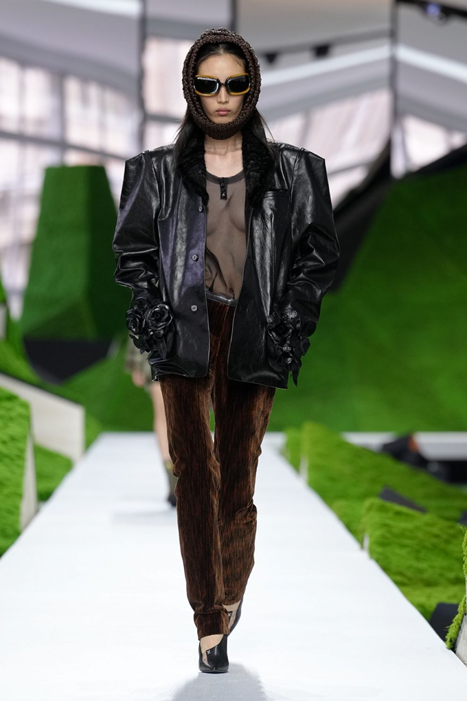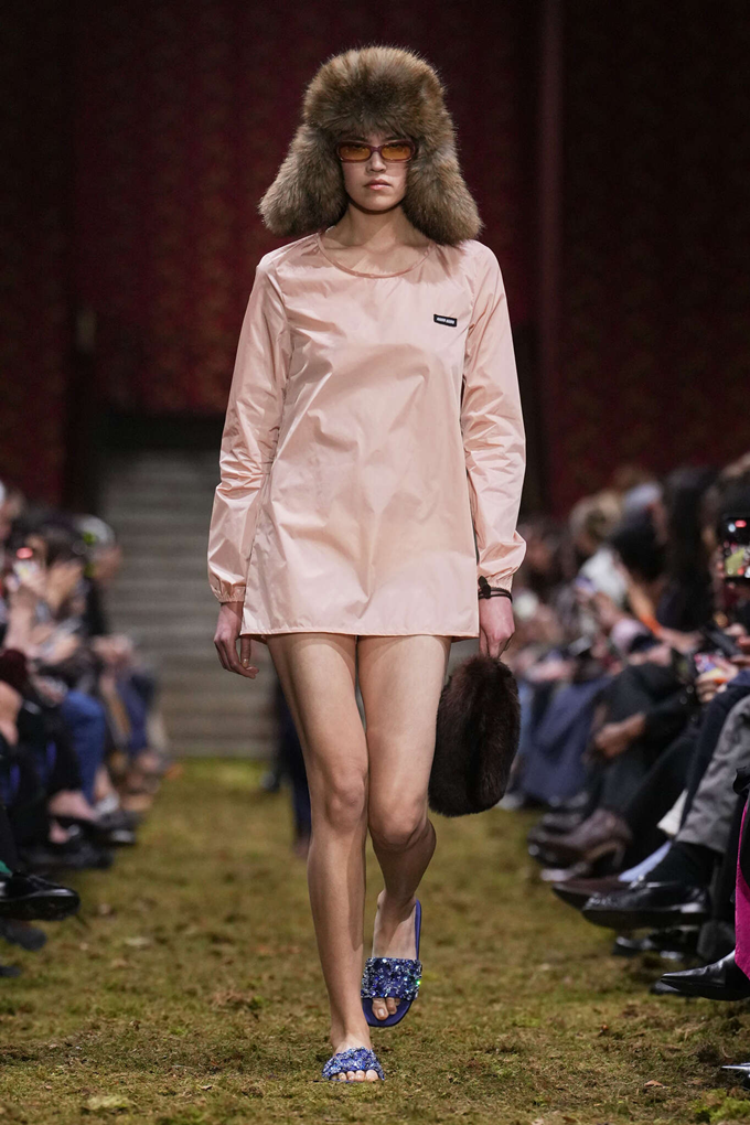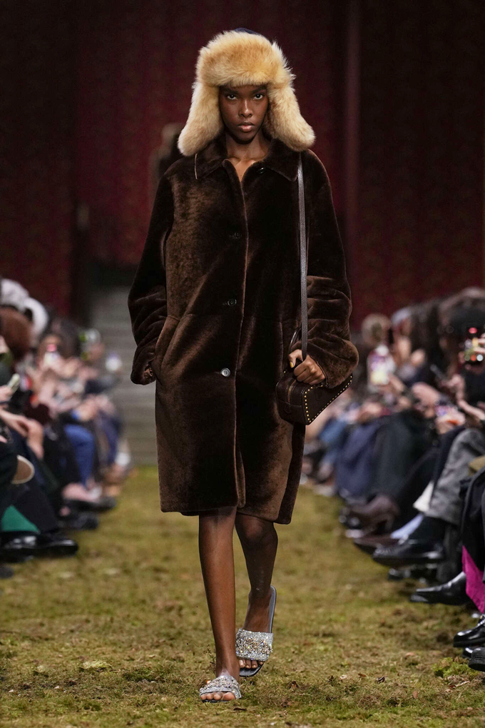 미우 미우는 풍성한 퍼 소재의 흔히 ‘군밤장수 모자’로 불리는 방한용 모자 트루퍼 햇을 대거 선보였다. 귀를 덮는 덮개가 달린 트루퍼 햇은 혹한 속에서 말을 타던 병사들이 체온을 유지하기 위해 착용하던 모자에서 유래했다.
