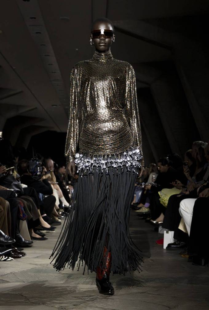 라반은 종이처럼 얇은 밀푀유 패널을 시그니처로 삼아 스커트와 드레스에 볼륨감 넘치는 프린지 가닥으로 입체감을 불어넣으며 드라마틱한 실루엣을 부여했다.