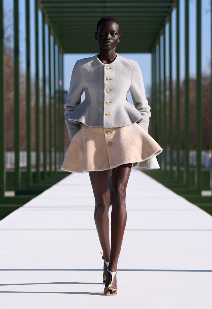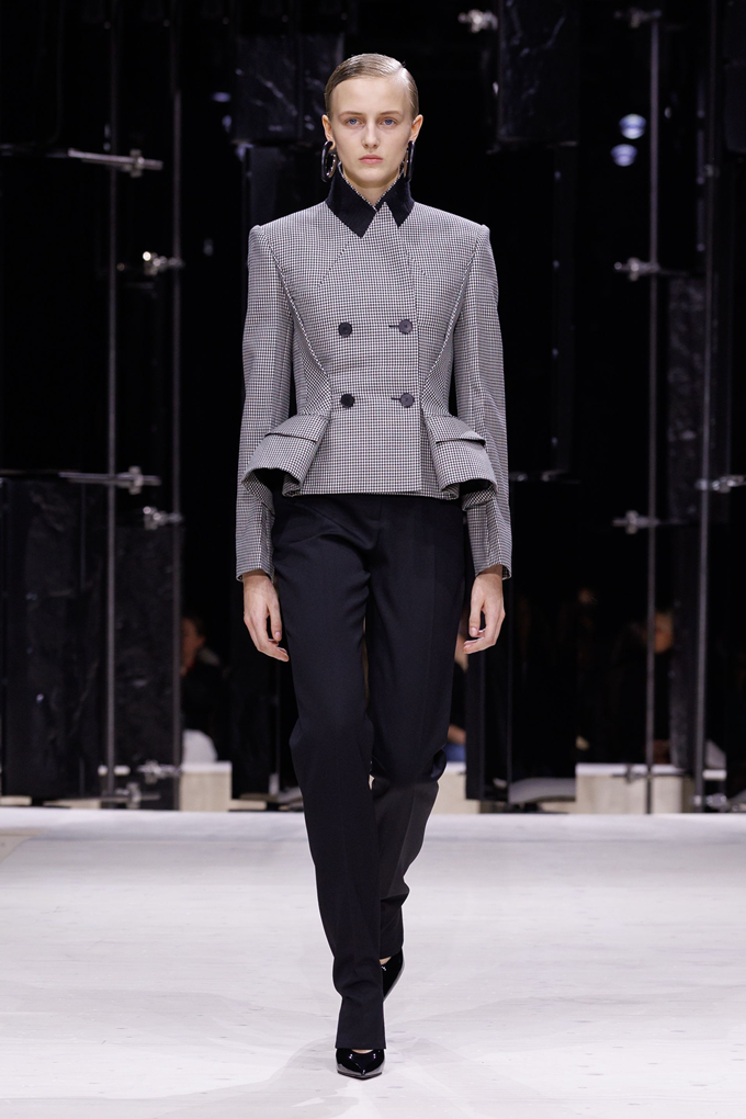 디올의 조나단 앤더슨은 허리가 잘록하고 골반 라인이 과장된 아워글래스 형태의 바 재킷을 대거 선보이고 드레스와 블레이저에도 페플럼 실루엣을 접목시켰다.