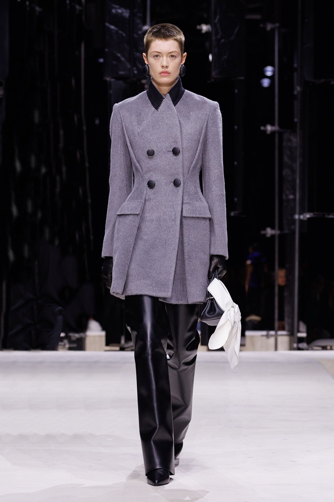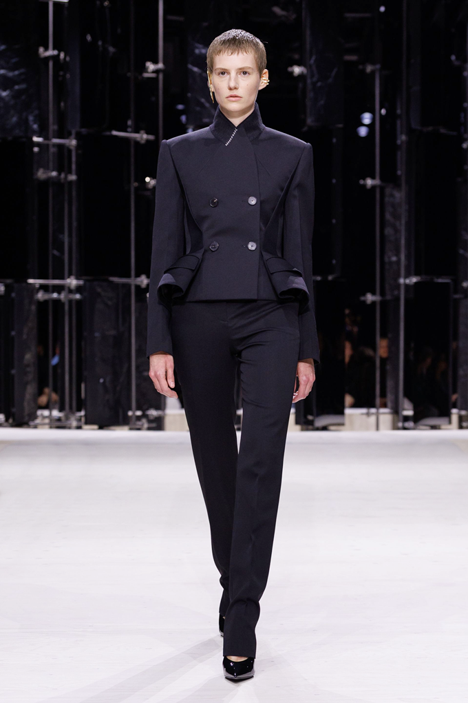 지방시는 날카롭게 재단한 변형된 라펠과 연미복 형태의 슈트룩으로 강렬한 인상을 남겼다.