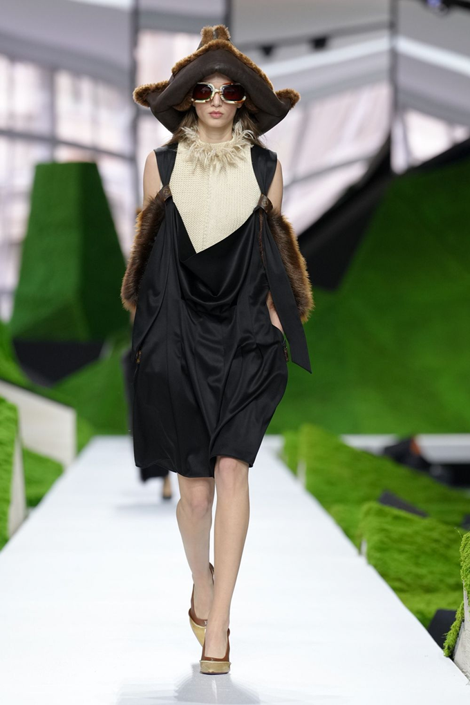 루이비통은 유목민의 라이프스타일에서 영감을 받은 양털 삼각모자를 비롯해 손잡이가 달린 커다란 밀짚 바구니 모양 모자, 중세 시대에서 영감을 받은 원뿔형 머리 장식 등을 선보였다.