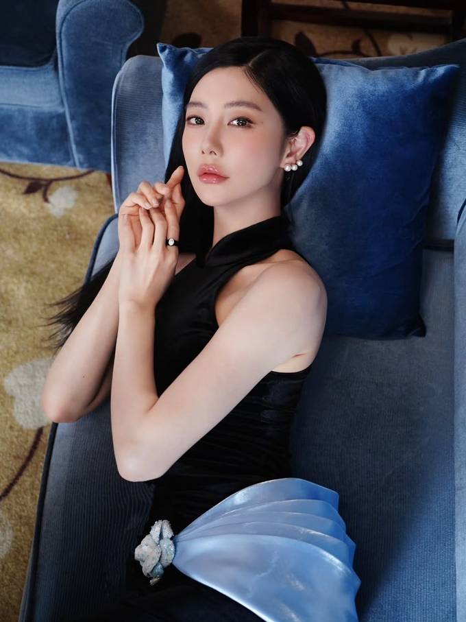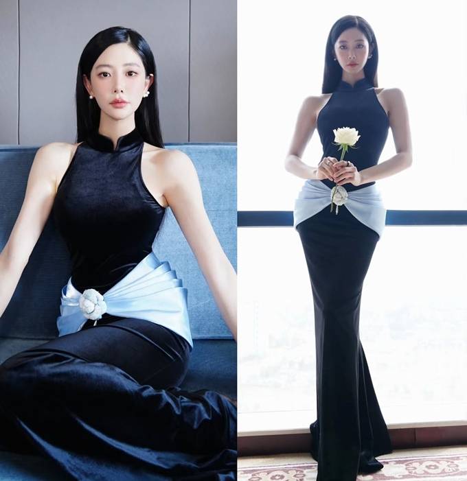 특히 허리 부분에 두른 은은한 파스텔 블루 컬러의 드레이프 장식이 더해져 블랙 드레스에 포인트를 더했다.