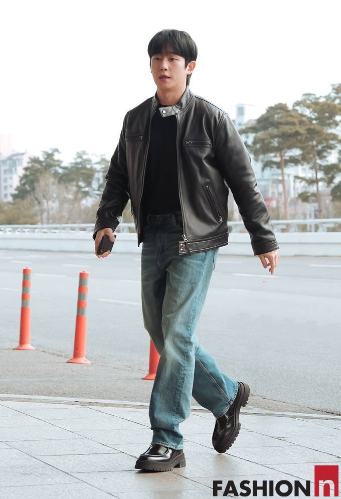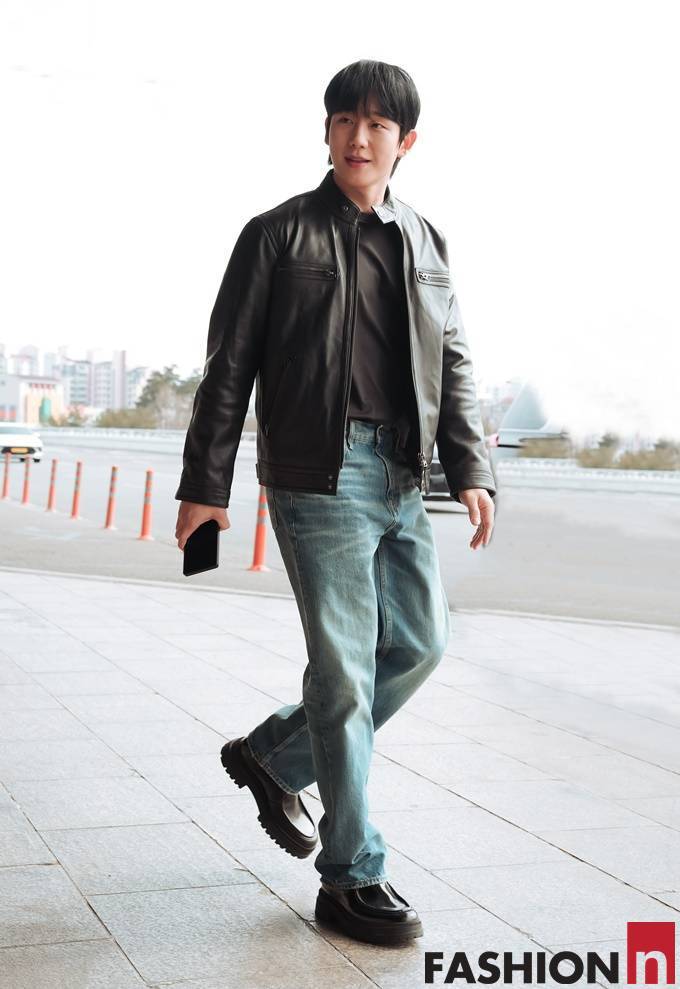 [패션엔 포토] 정해인, 가죽 재킷과 청바지 조합! 강렬한 존재감 록시크 라이더룩 상해 출국
