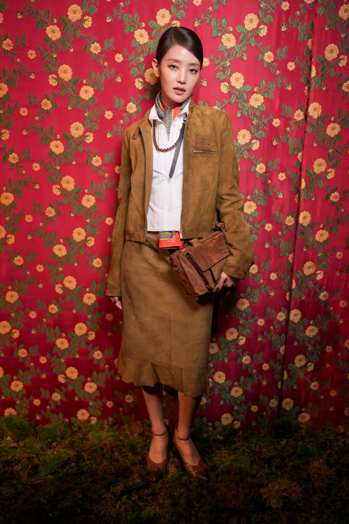 10. 걸그룹 트와이스 미나는 파리 패션위크 2026 F/W 미우 미우 컬렉션에서 스웨이드 스커트 투피스룩으로 빈티지한 멋을 선사했다.