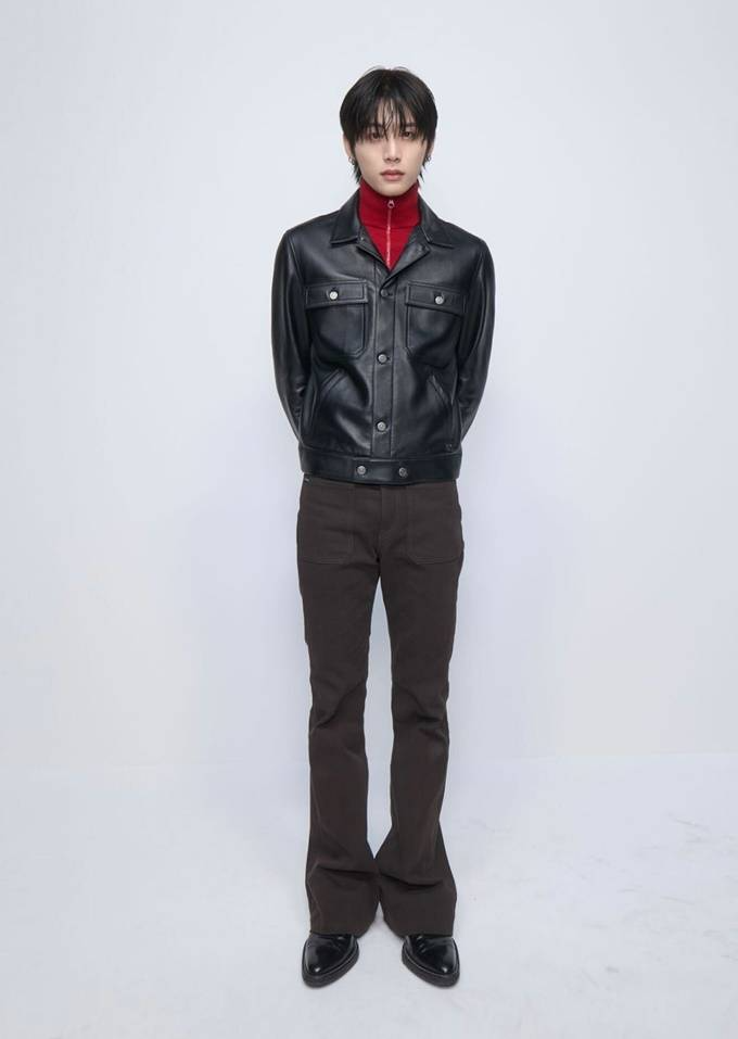 27. 그룹 보이넥스트도어(BOYNEXTDOOR) 태산은 파리 패션위크 2026 F/W 꾸레주 컬렉션에서 레드 터틀넥과 클래식한 가죽 재킷을 매치한 레더룩을 선보였다.