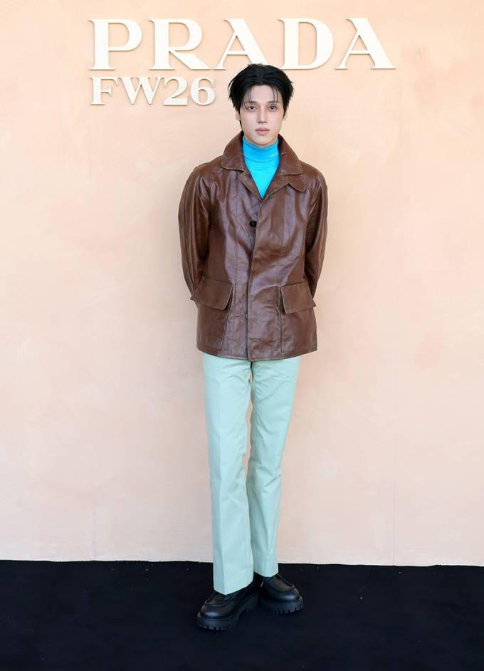 16. 그룹 에이티즈(ATEEZ) 우영은 밀라노 패션위크 2026 F/W 프라다 패션쇼에서 빈티지 가죽 블루종과 터틀넥 스웨터와 포플린 팬츠를 매치한 레더룩을 완벽히 소화했다.
