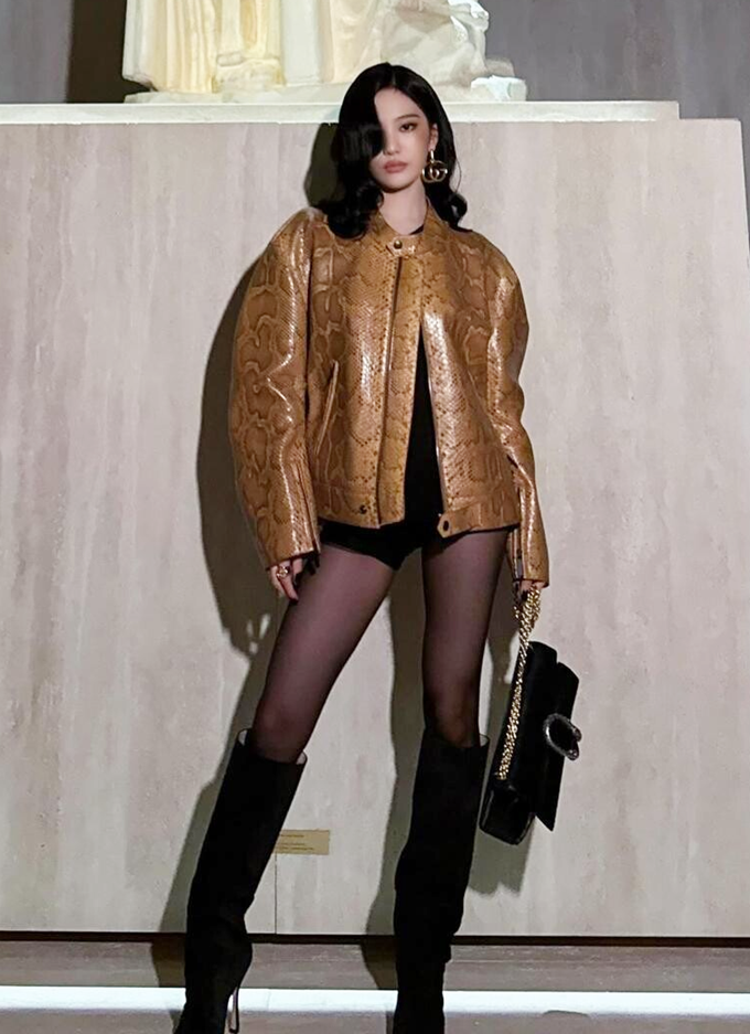 17. 걸그룹 에스파 닝닝은 밀라노 패션위크 2026 F/W 구찌 패션쇼에서 파이톤 가죽 재킷으로 강렬한 하의실종 레더룩을 연출했다.