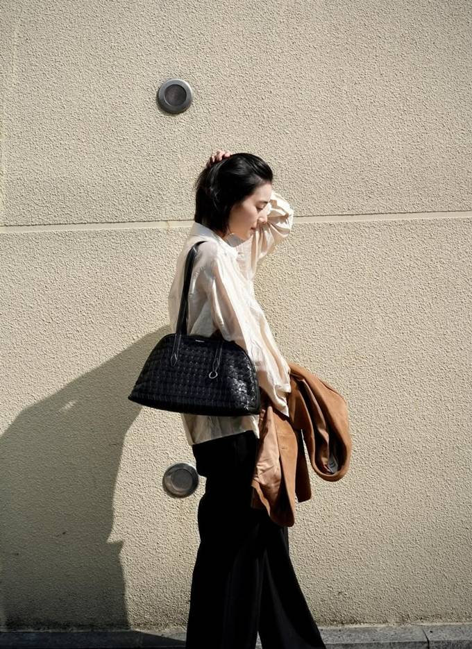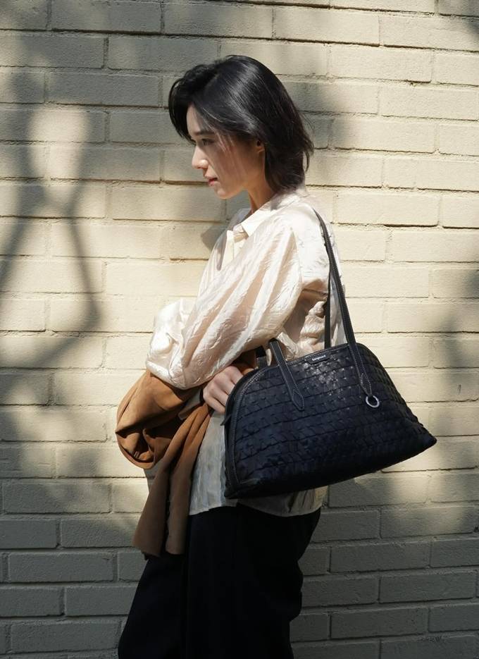 여기에 브라운 컬러 재킷을 가볍게 팔에 걸쳐 내추럴한 분위기를 더했고, 블랙 위빙 레더 백을 포인트로 들어 고급스러운 무드를 살렸다.