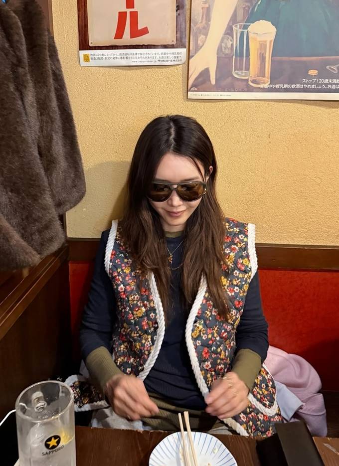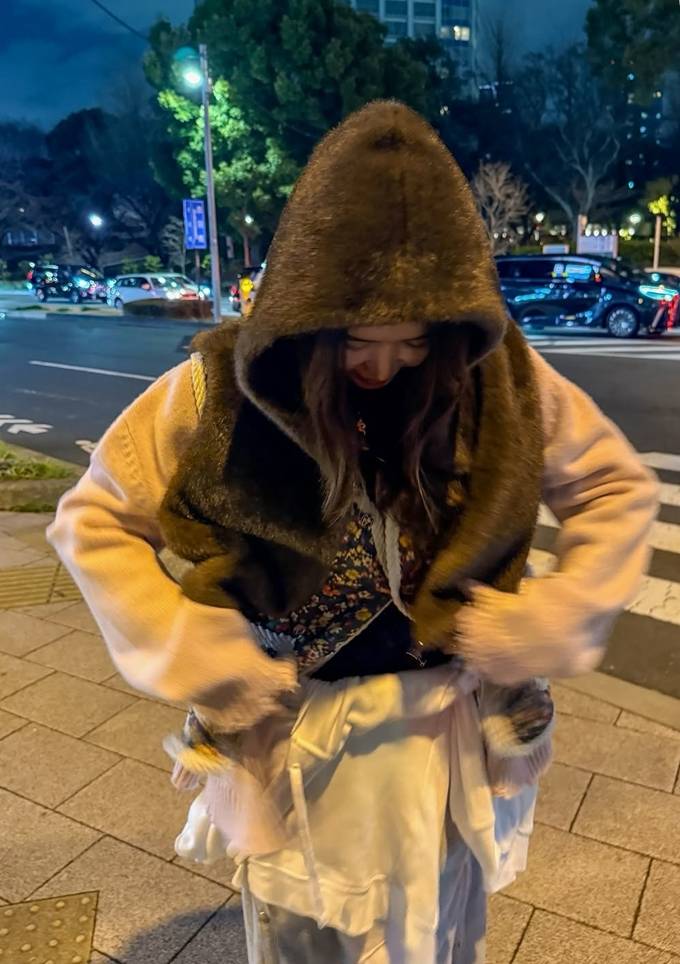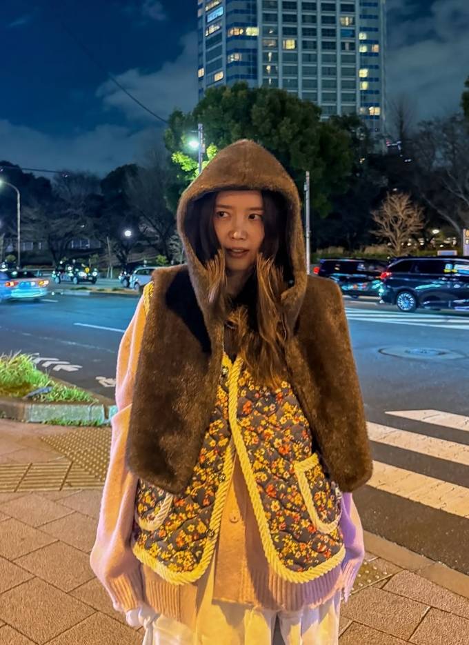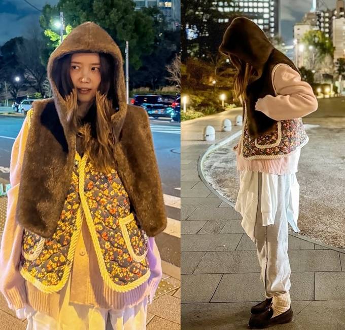 배우 채정안이 도쿄에서 니트 위에 할머니 조끼와 후드 퍼 조끼를 레이어드 스타일로 따뜻하면서도 스타일리시한 밤 산책룩을 선보였다.