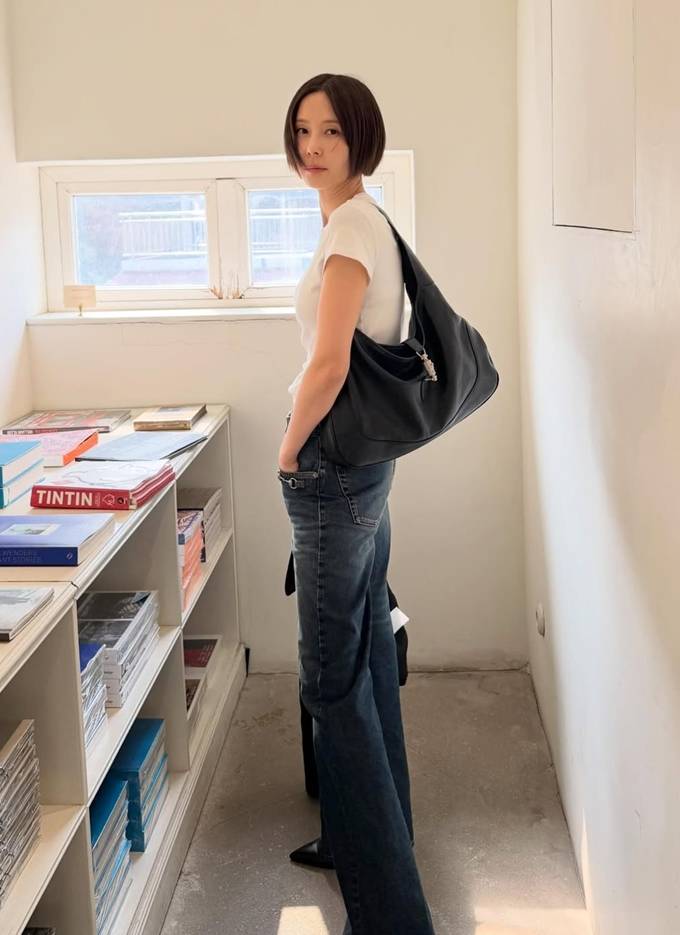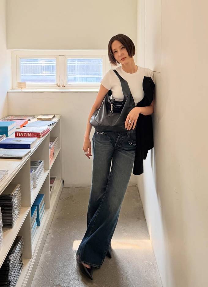 공개한 사진에서 김나영은 화이트 반팔 티셔츠에 금빛 버튼이 눈에 띄는 블랙 크롭 재킷을 입고 와이드 핏 데님 팬츠를 매치한 데일리룩으로 하체가 더 길어 보이는 스타일을 선보였다.