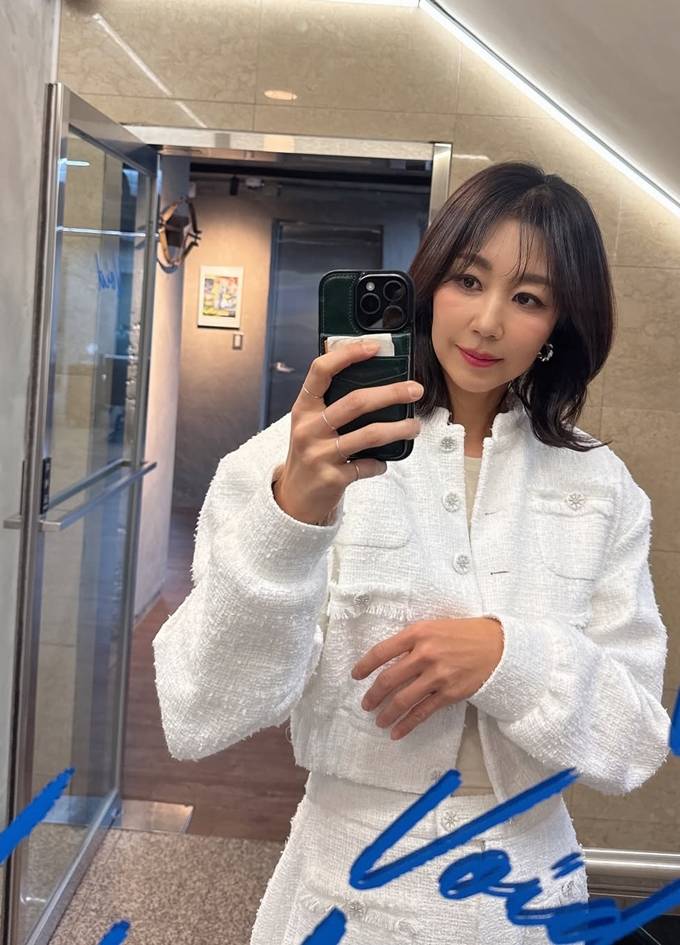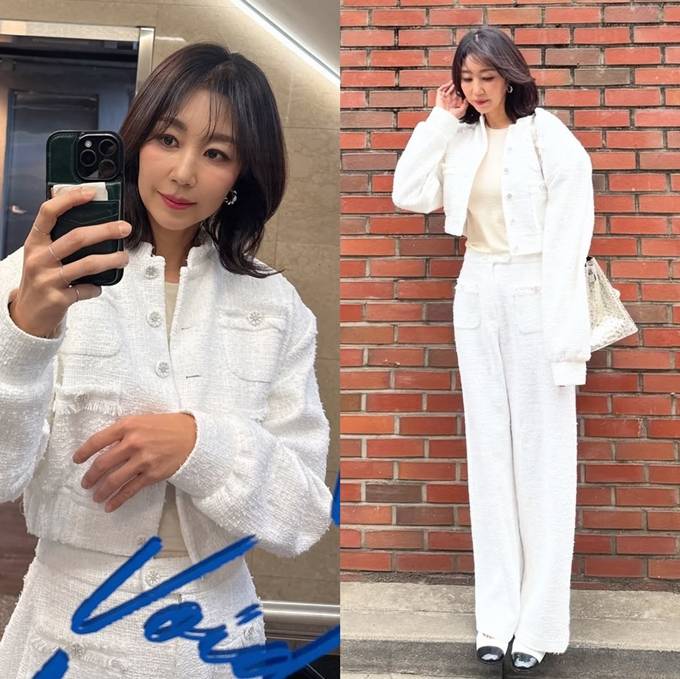 공개한 사진에서 전미라는 화이트 트위드 팬츠와 크롭 재킷에 아이보리 이너를 매치한 슈트룩으로 단아하면서도 시크한 분위기를 드러냈다.
