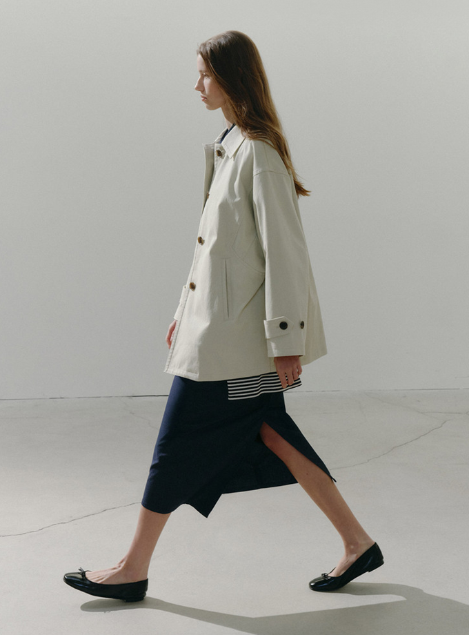 '쉬즈미스' 하프 트렌치 코트는 탄탄한 코튼 100소재의 클래식한 더블 브레스티드 스타일로 단정한 테일러드 칼라와 미니멀한 디자인으로 클래식한 분위기를 강조했다.