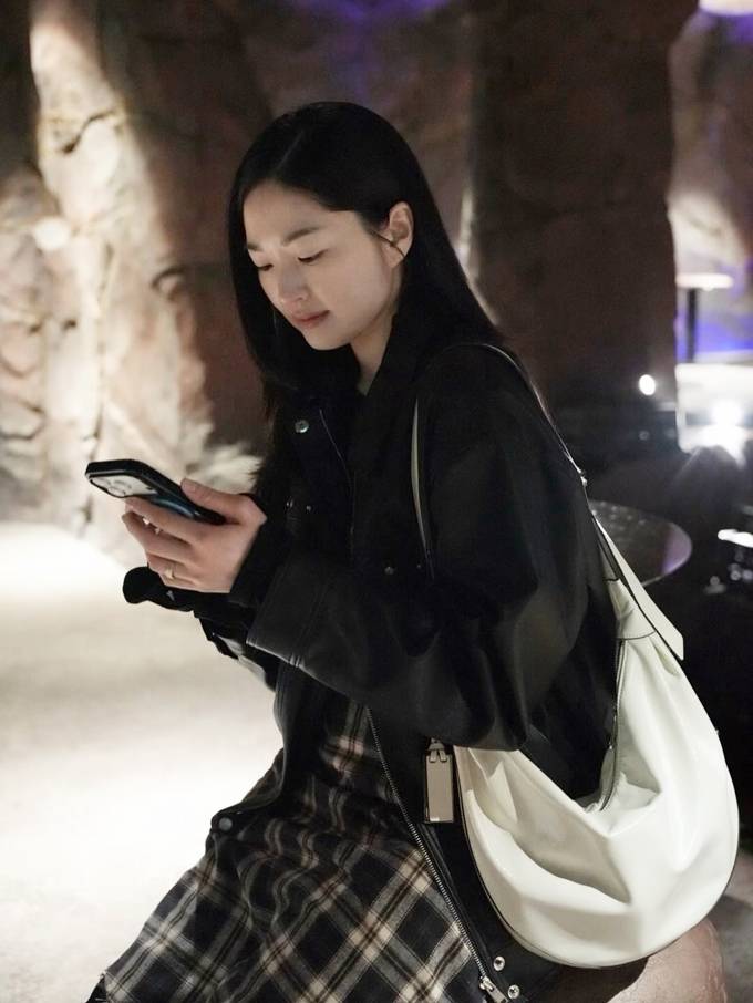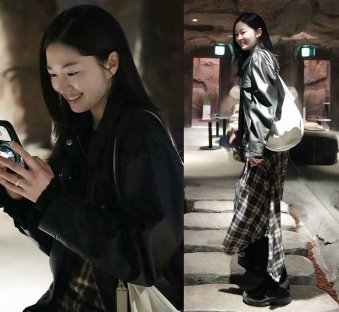 공개한 사진에서 류이서는 캐주얼 팬츠 위에 체크 스커트를 레이어드하고 가죽 재킷을 매치한 외출룩으로 밤 까페 데이트를 즐겼다.
