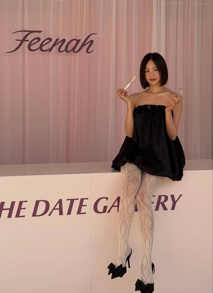 여기에 레이스 패턴의 화이트 스타킹을 매치해 은은한 포인트를 더하며, 전체 스타일에 로맨틱한 감성을 더했다.