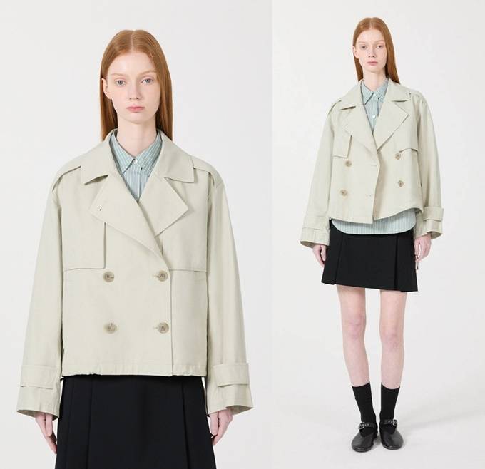 '쉬즈미스' 하프 트렌치 코트는 탄탄한 코튼 100소재의 클래식한 더블 브레스티드 스타일로 단정한 테일러드 칼라와 미니멀한 디자인으로 클래식한 분위기를 강조했다.