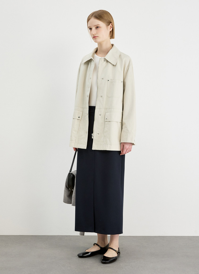 베이지, 카키 2가지 컬러로 출시되었으며 힙을 덮는 미디 기장으로 심플한 니트와 청바지 툭 걸쳐 주기만해도 특유의 도회적이고 세련된 스타일링을 완성한다.