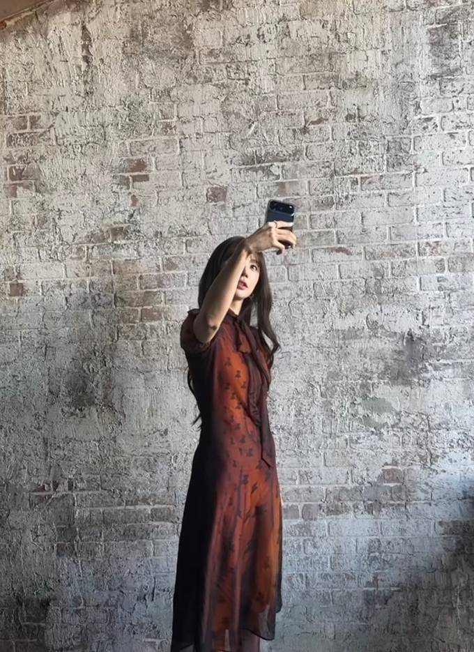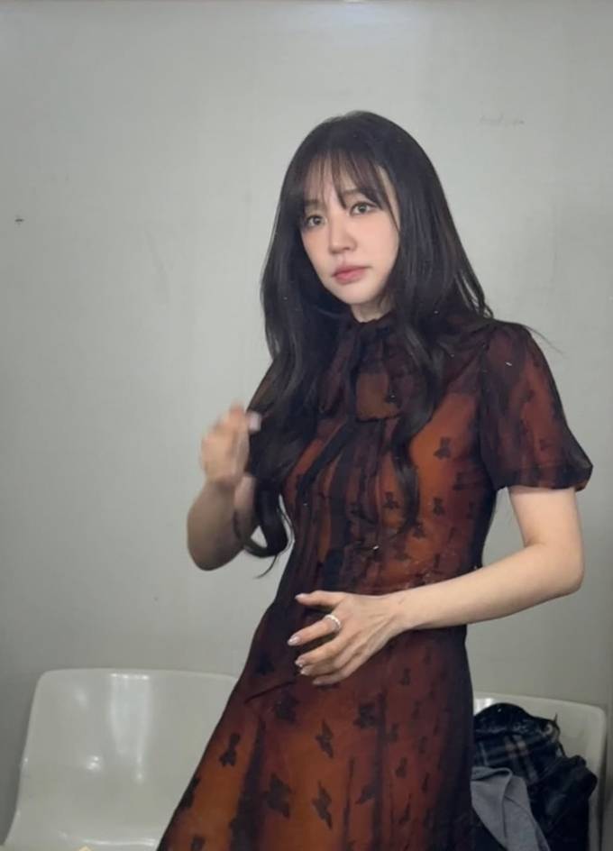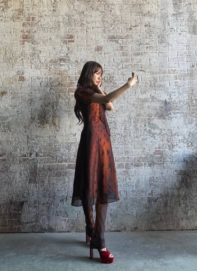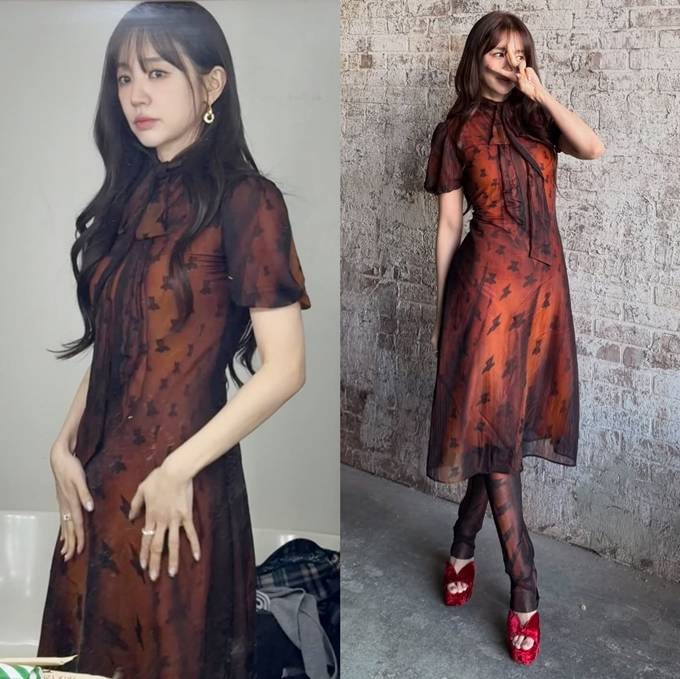 공개한 사진에서 윤은혜는 얇게 비치는 소재 위로 더해진 패턴 디테일과 레드 브라운 컬러의 시스루 원피스를 착용하고 우아하면서도 몽환적인 매력을 드러냈다. 특히 하이넥 디자인과 리본 디테일은 클래식한 분위기를 강조하며, 자연스럽게 떨어지는 실루엣은 체형을 부드럽게 감싸 여성스러운 라인을 완성했다.