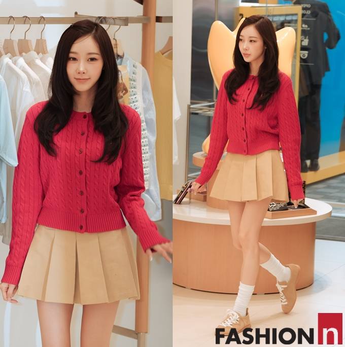 이날 지젤은 긴 웨이브 헤어 스타일에 레드 컬러의 케이블 니트 카디건과 베이지 플리츠 스커트를 매치한 프레피룩으로 화사하면서도 싱그러운 봄 패션을 선보였다. 완성했다.