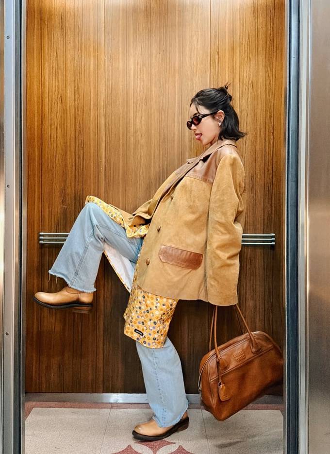여기에 와이드 데님 팬츠를 레이어드해 트렌디한 실루엣을 강조하며, 클래식한 브라운 레더 백으로 전체 룩에 통일감을 더했다.