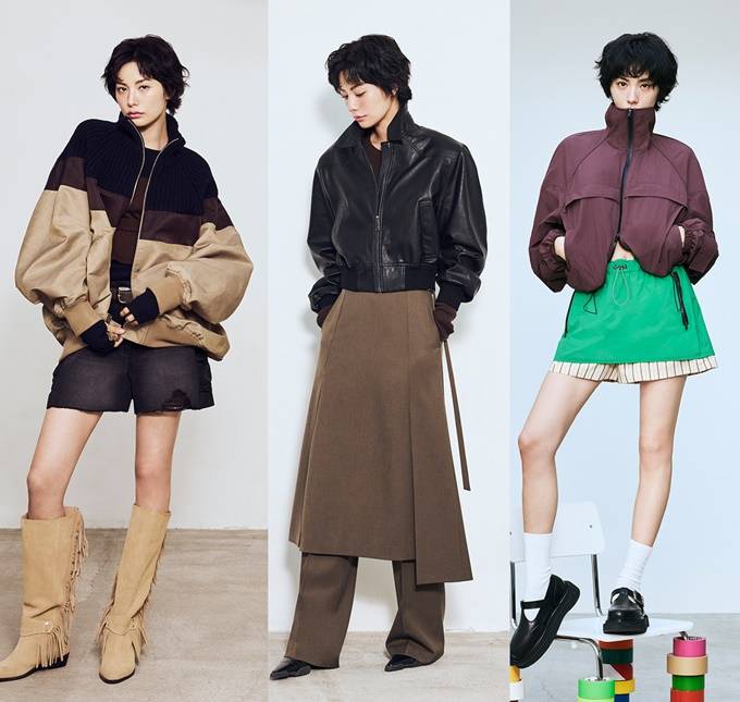 영 컨템포러리 브랜드 '이비엠' 하이넥 크롭 집업 점퍼는 라글란 슬리브와 절개선 디테일, 배색 라인을 활용해 입체적인 실루엣을 강조했다.