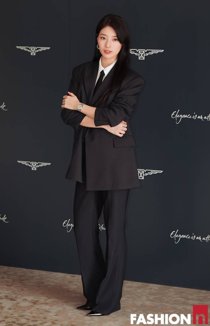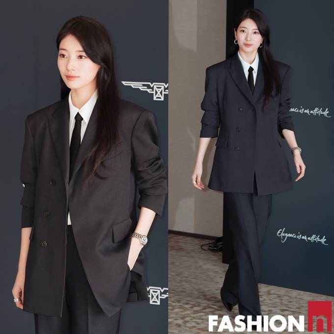 이날 수지는 롱 웨이브 생머리에 다크 네이비 상하의 셋업 슈트를 입고, 화이트 셔츠에 블랙 타이와 미니멀 액세서리 등을 매치한 나들이룩으로 러블리한 시크미를 발산했다.