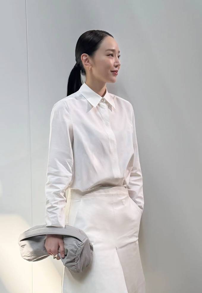 배우 신혜선이 깔끔하게 정돈한 로우 포니테일 스타일에 올 화이트 스타일로 봄 미니멀룩의 정수를 선보였다.