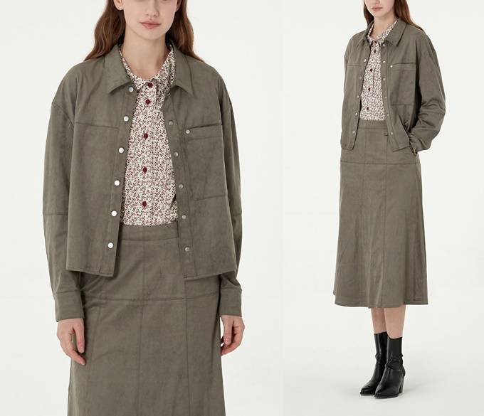 여성 트러디셔널 브랜드 '키이스(KEITH)의 스웨이드 셔츠 재킷과 스커트 셋업은 유연한 터치감이 고급스러운 분위기를 자아내는 간절기 투피스룩으로 제격이다.