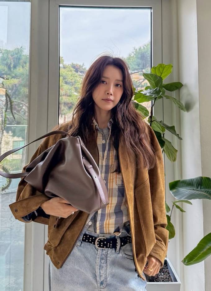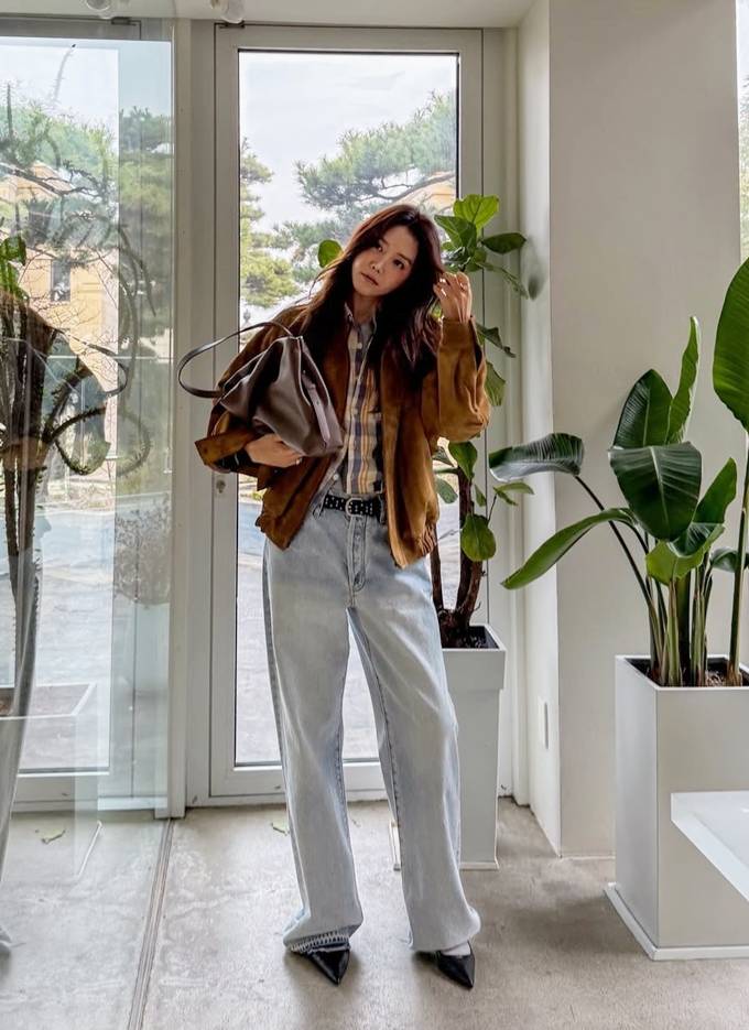 공개한 사진에서 채정안은 브라운 컬러의 오버핏 스웨이드 봄버 재킷을 중심으로 한 편안하면서도 스타일리시한 룩을 완성했다.
