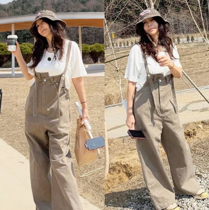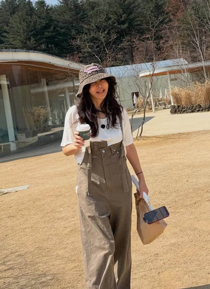 공개한 사진에서 황신혜는 화이트 반팔 티셔츠에 멜빵 팬츠를 입고 버킷햇을 매치한 나들이룩으로 좀 이른 듯한 봄 외출 스타일을 선보였다.