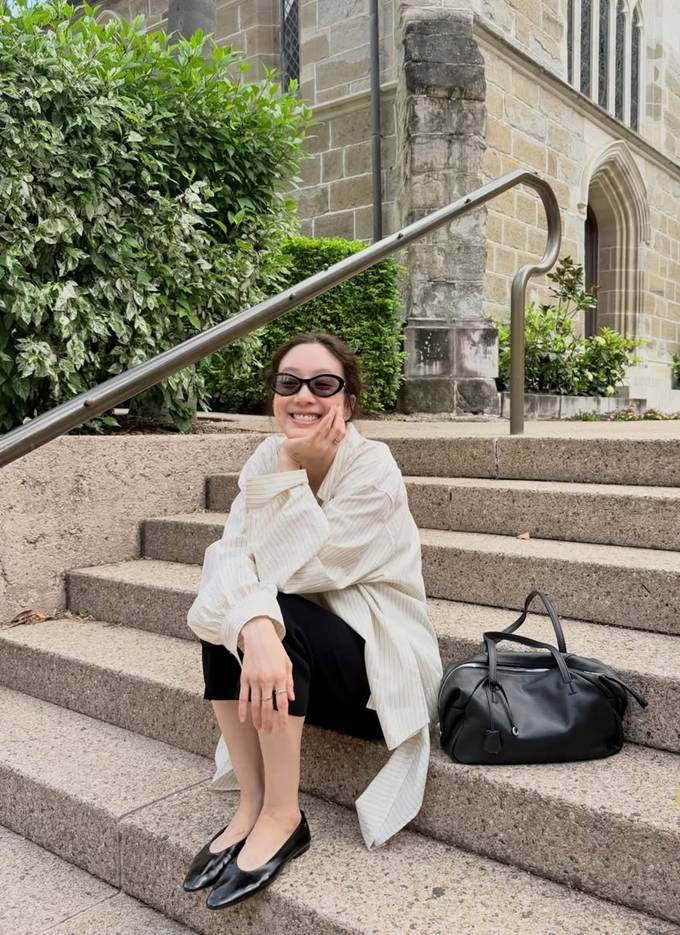 정려원, 호주에서 미니멀 라이프! 여유있는 루즈핏 스트라이프 셔켓 산책룩
