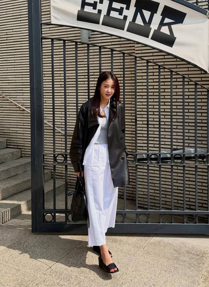 이시영, 가죽 봄 코디 제대로다! 블랙 레더에 화이트 스커트 블랙&화이트 레이어드 나들이룩