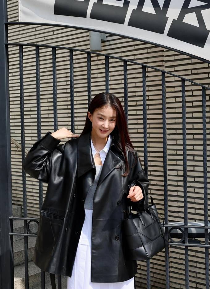 특히 블랙 레더 재킷과 화이트 롱 스커트로 멋스러운 봄 코디를 완성했다.
