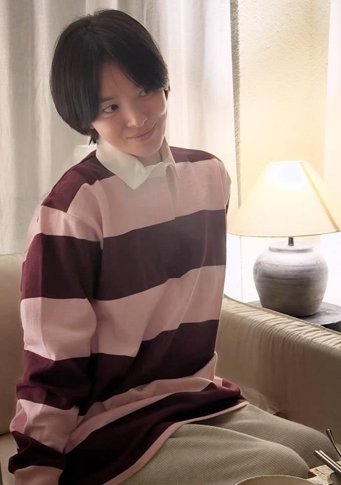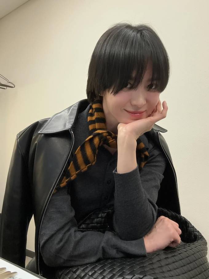 배우 송혜교가 요즘 즐겨 입는 레더 재킷 데일리룩으로 숏컷 미모를 뽐냈다.