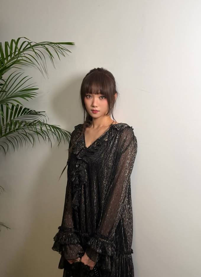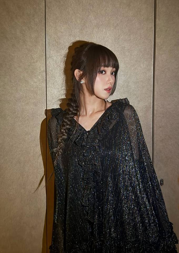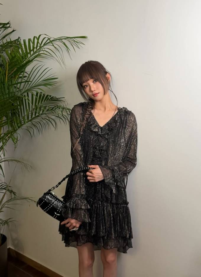 은은한 펄감이 돋보이는 블랙 시스루 드레스를 착용해 고급스러우면서도 몽환적인 무드를 완성했다.