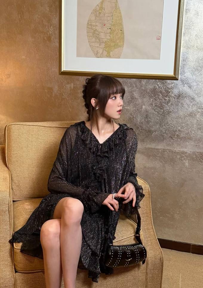 특히 프릴 디테일이 더해진 브이넥 라인은 여성스러운 실루엣을 극대화하며, 여리여리한 무드를 한층 끌어올렸다.