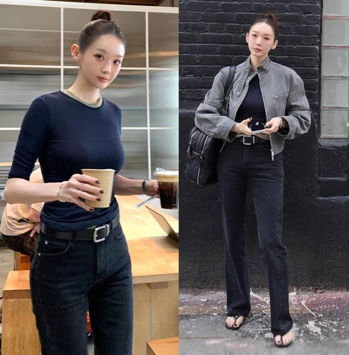 여성 듀오 그룹 다비치의 강민경이 슬림한 톱에 데님 팬츠를 매치한 주말 데일리룩으로 군더더기 없는 슬림 핏의 정석을 선보였다.