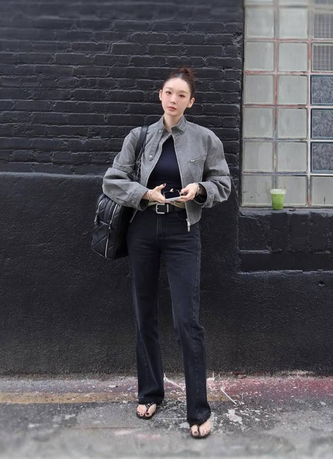 여기에 크롭 기장의 그레이 재킷을 매치해 한층 시크한 무드를 완성했다. 짧은 아우터와 길게 떨어지는 팬츠의 대비가 다리 라인을 더욱 길어 보이게 하는 효과를 가져왔다.