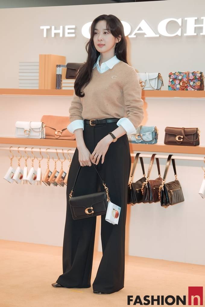 이청아는 화이트 셔츠에 니트 스웨터를 레이어드하고 오버핏 브라운 팬츠를 매치한 나들이룩으로 미니멀하면서도 러블한 스타일을 선보였다.