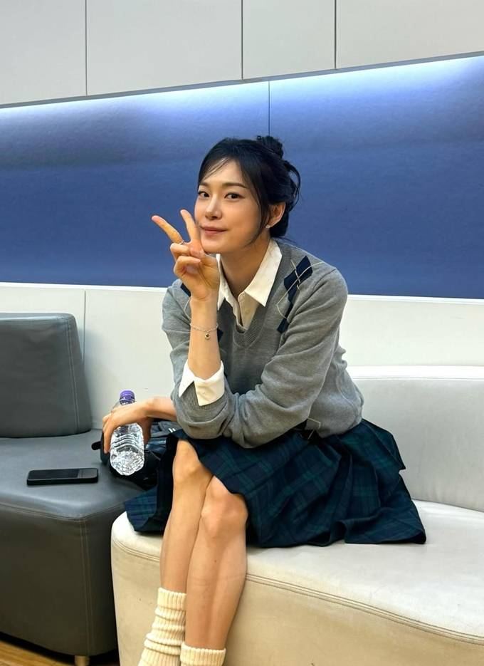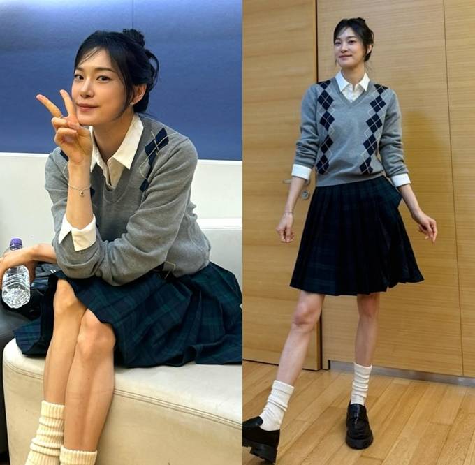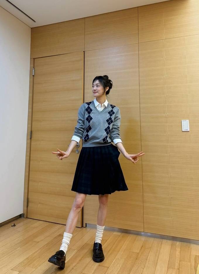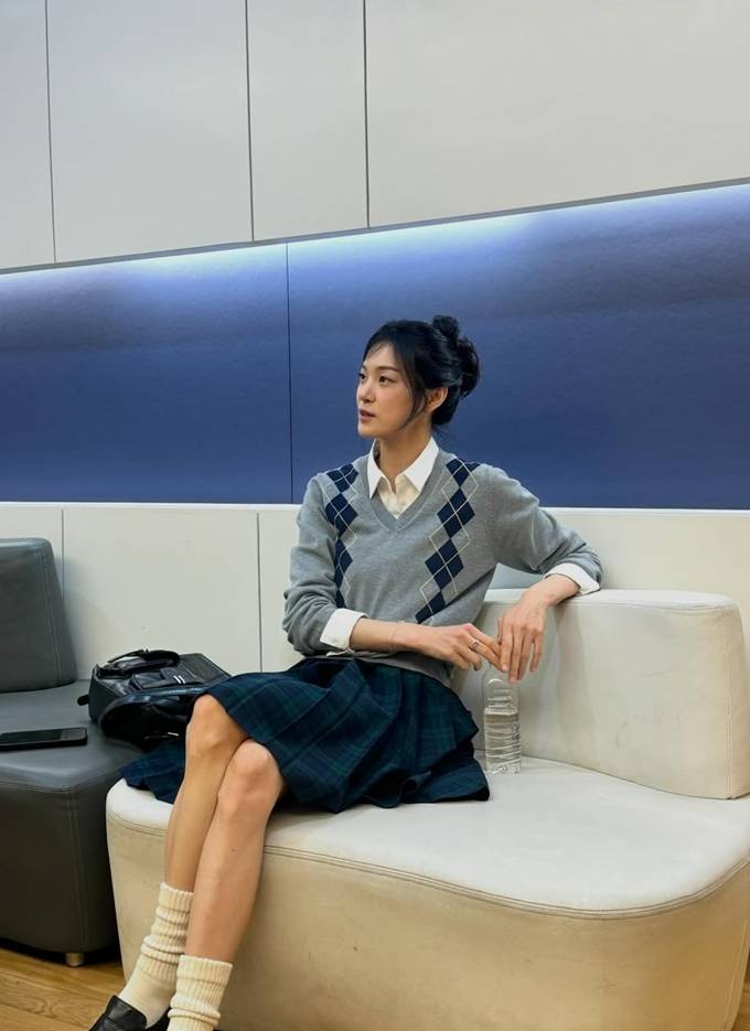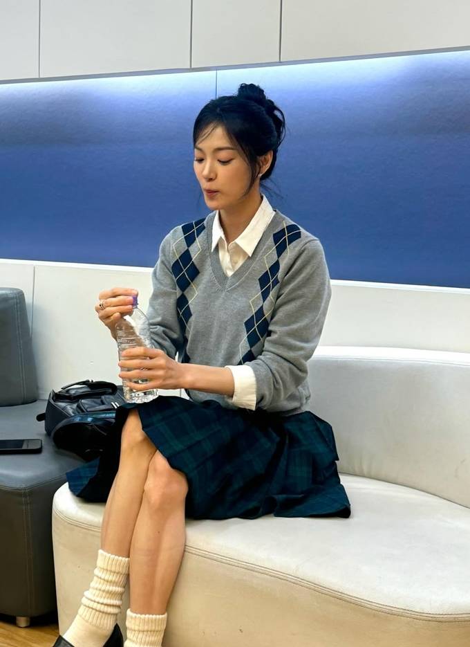 공개한 사진에서 옥자연은 올려 묶은 생기발랄 헤어 스타일에 화이트 셔츠와 아가일 패턴의 니트 스웨터를 레이어드하고 블랙 플리츠 스커트를 매치한 프레피룩으로 더 어려 보이는 하이틴 스타일을 완성했다.