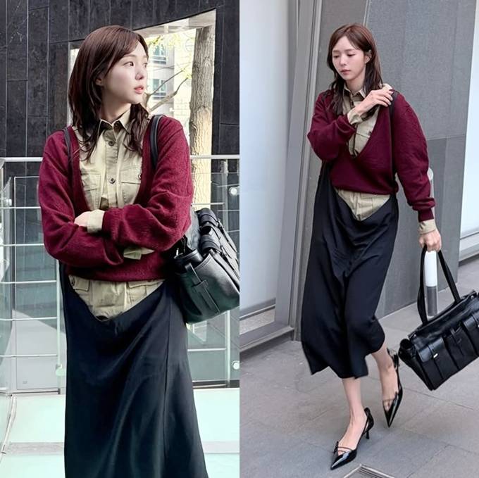 또 여기에 블랙 롱 스커트를 매치해 청순하면서도 여성스러운 외출룩을 선보였다.