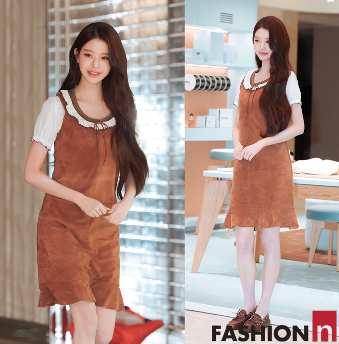 이날 장원영은 롱 웨이브 헤어에 카키 컬러의 넥과 화이트 프릴 러플이 포인트로 들어간 스웨이드 재질의 브라운 원피스룩으로 걸리시하면서도 러블리한 요정미를 발산했다.