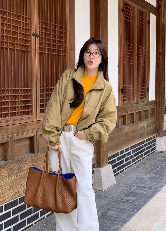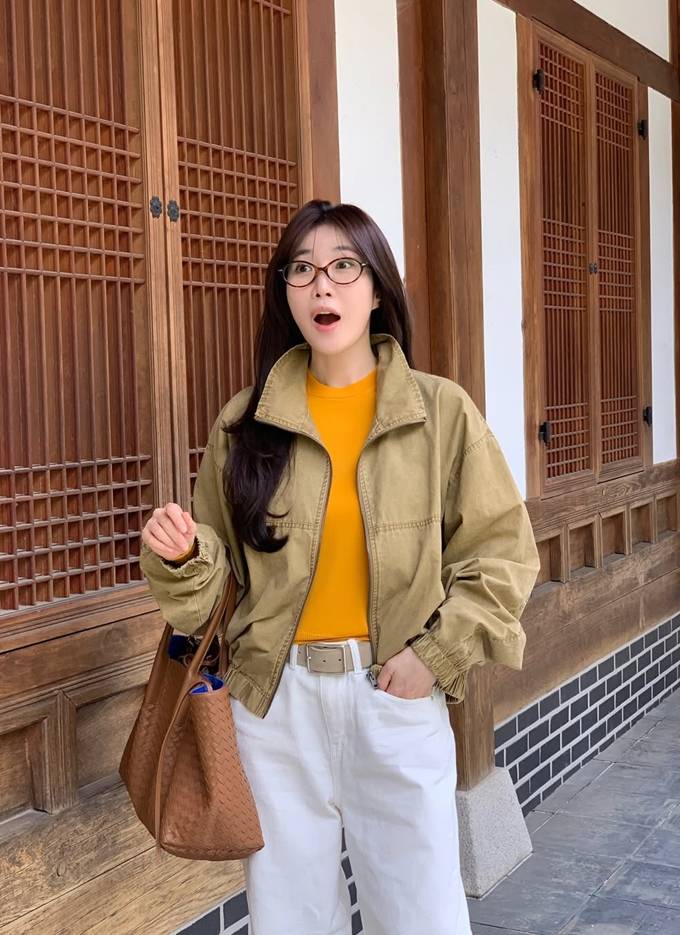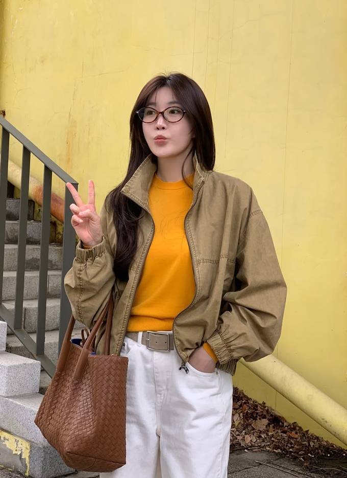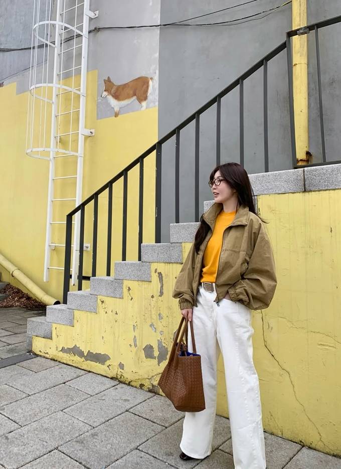 1. 1.이해리, 봄 꽃놀이와 찰떡! 옐로&브라운 티셔츠와 봄버 재킷 톤온톤 나들이룩