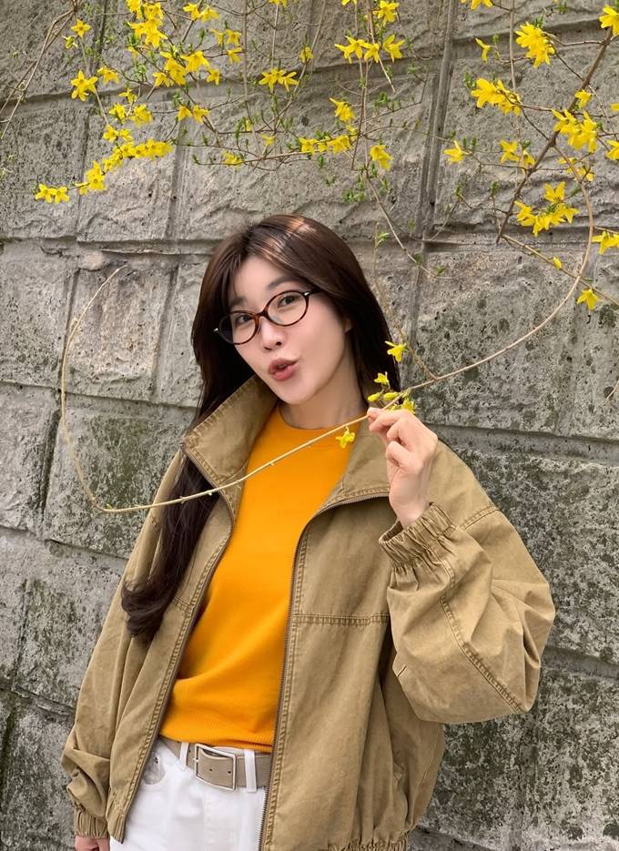 공개한 사진에서 이해리는 옐로 티셔츠에 브라운 컬러의 봄머 재킷을 걸친 톤온톤 스타일로 개나리와 찰떡 궁합을 과시한 나들이룩을 선보였다.