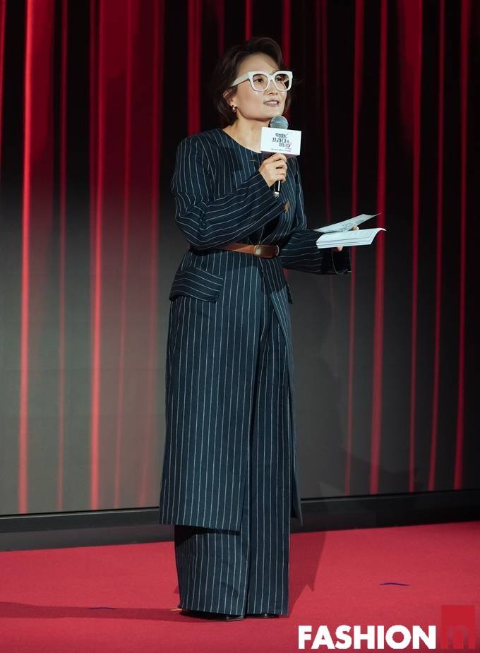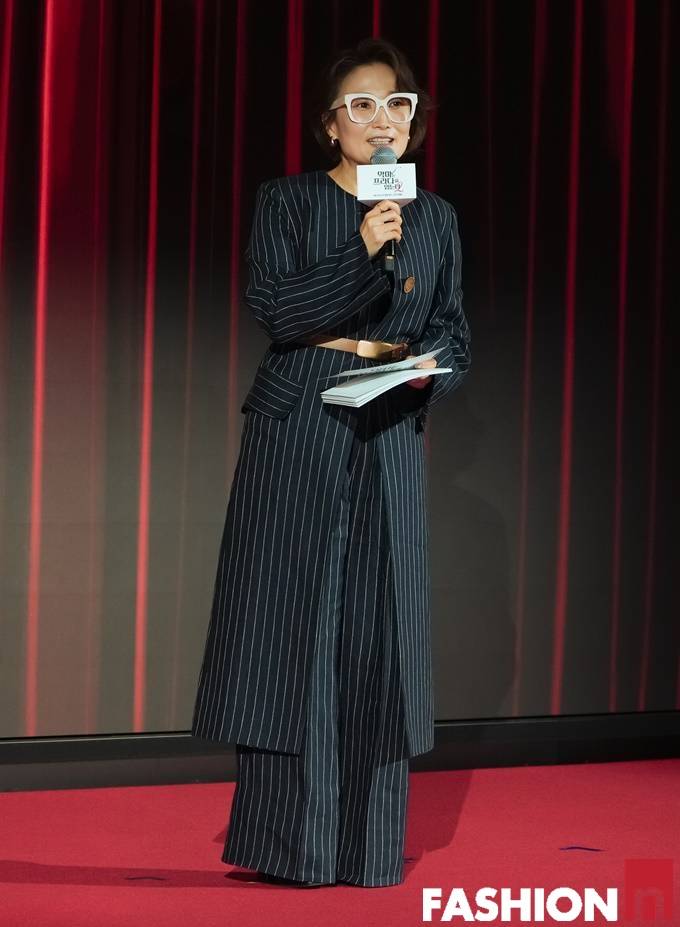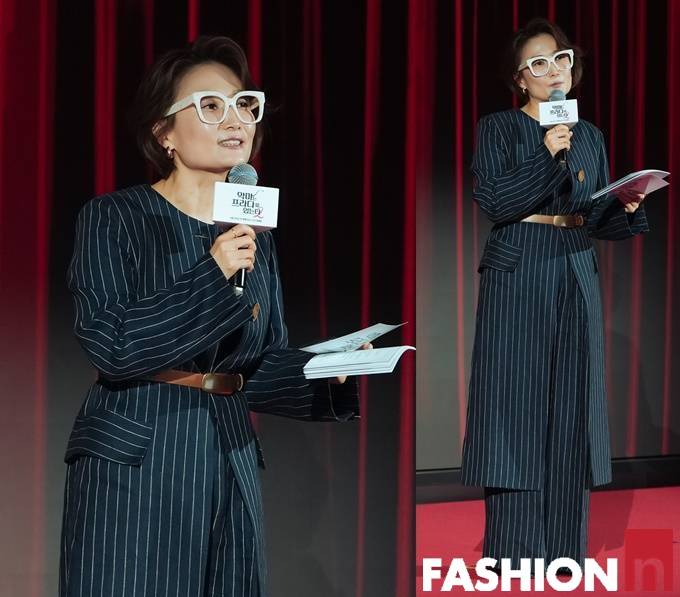방송인 박경림이 벨티드 스트라이프 슈트룩으로 파워풀한 에디터룩을 연출했다.