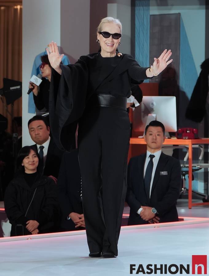 메릴 스트립은 기자 간담회에서 착용한 강렬한 레드 슈트를 벗고 블랙 원숄더 케이프 점프슈트 드레스를 착용, 압도적인 존재감으로 팬들을 열광시켰다.