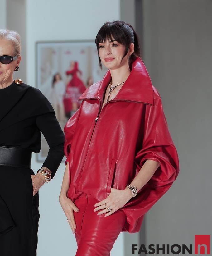 앤 해서웨이는 뭉게 구름을 연상시키는 오프숄더 블라우스를 벗고 강렬한 레드 컬러의 가죽 봄버 재킷과 롱스커트를 매치한 강렬한 레더 투피스룩으로 또 다른 반전 매력을 발산했다.
