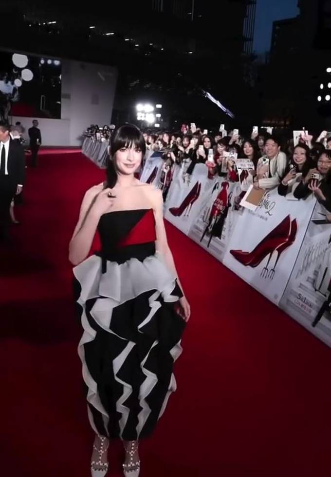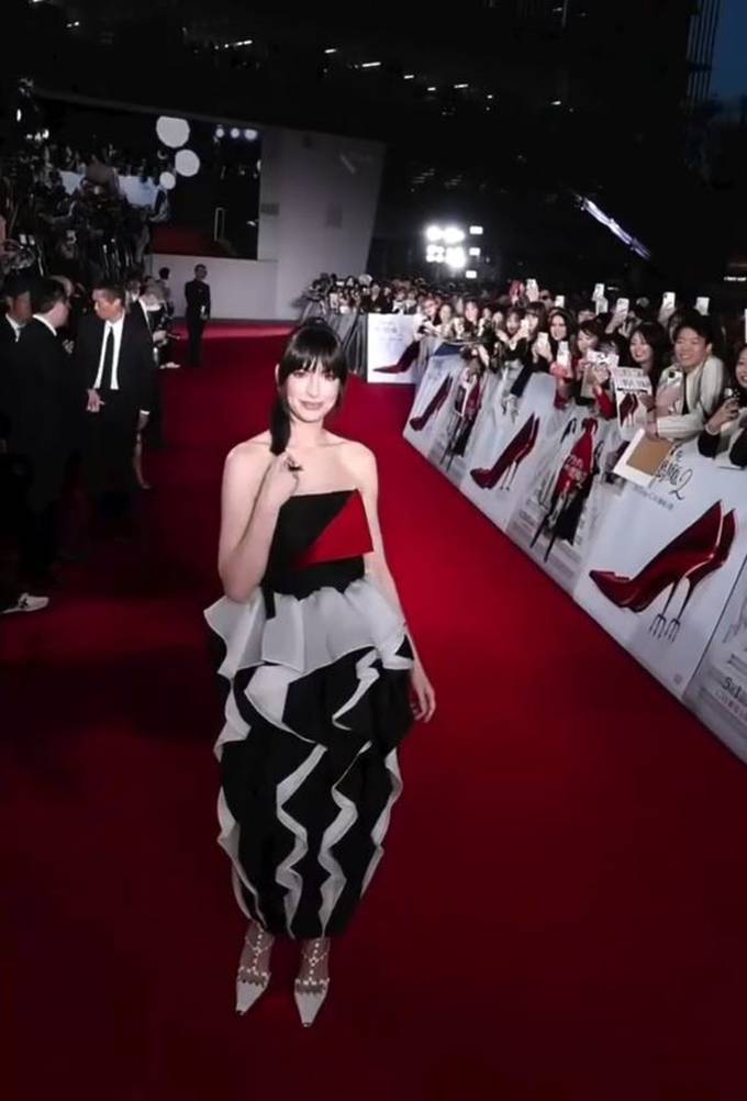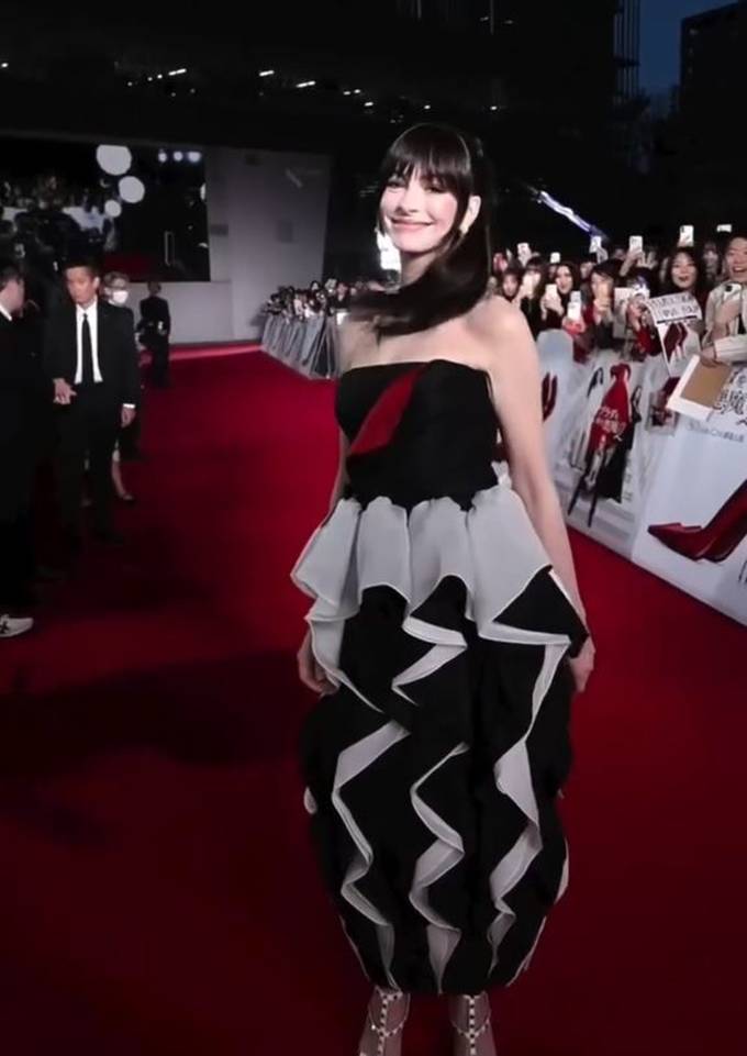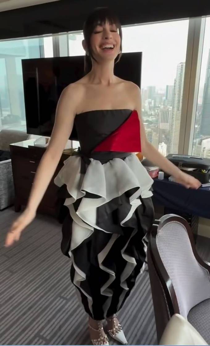 일본에서 앤 해서웨이는 쇄골 라인이 노출된 화려한 블랙&화이트의 오프숄더 코르셋 상의에 발목까지 내려오는 풍성한 러플 스커트 셋업의 드레스로 로맨틱하면서도 큐티한 프리미어룩을 선보였다.