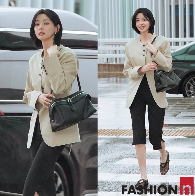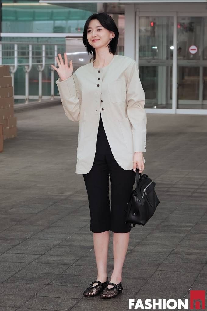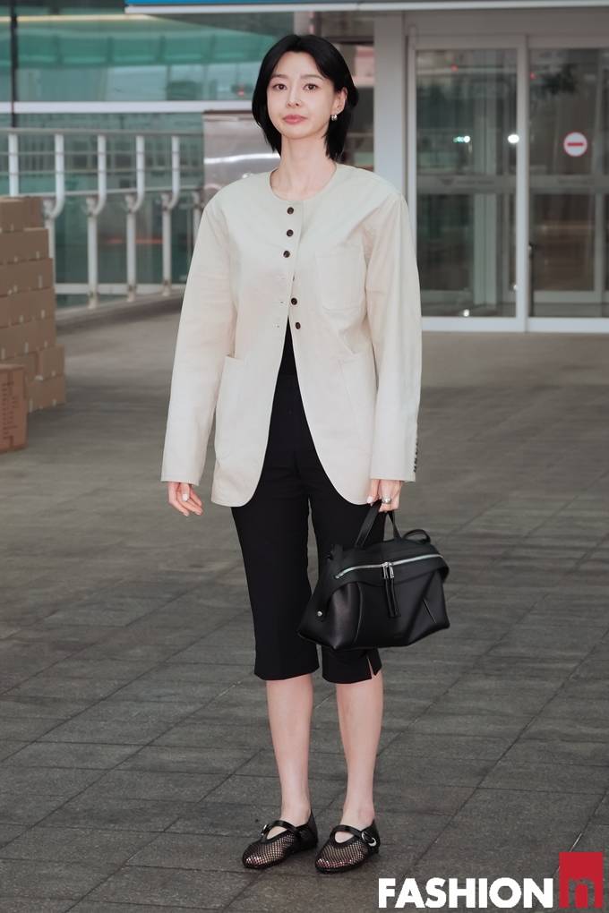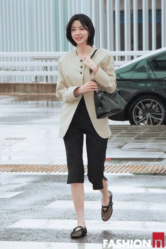 배우 권나라가 비 속에서도 7부 팬츠와 재킷 출국룩으로 숏컷 미모를 발산했다.