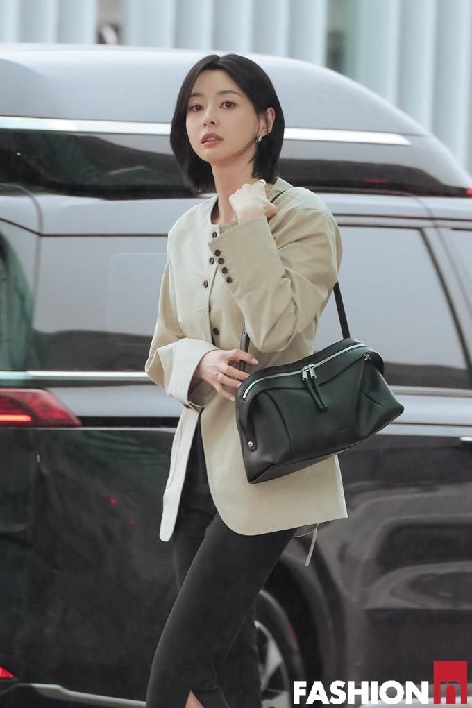 이날 권나라는 블랙 7부 팬츠에 몸에 핏된 아이보리 라운드 재킷을 걸친 레인룩으로 단아하면서도 깔끔한 출국 스타일을 완성했다.